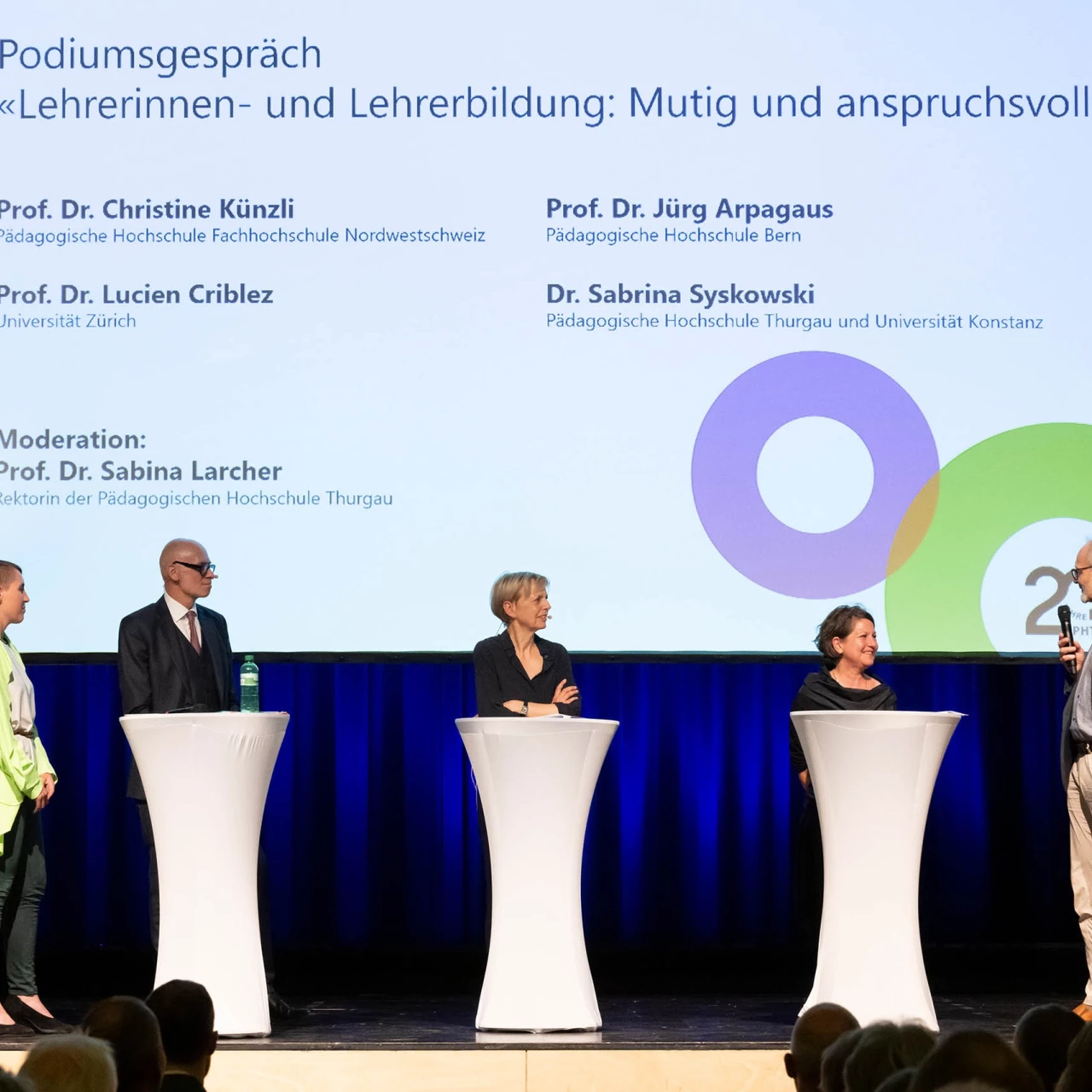 Im Anschluss an seinen Vortrag diskutierte ein hochkarätig besetztes Podium mit Prof. Dr. Jürg Arpagaus (PH Bern), Prof. Dr. Lucien Criblez (Universität Zürich), Prof. Dr. Christine Künzli David (PH FHNW) und Dr. Sabrina Syskowski (Universität Konstanz), unter der Moderation von Sabina Larcher, die Entwicklungsszenarien für die Lehrerinnen- und Lehrerbildung der Zukunft.