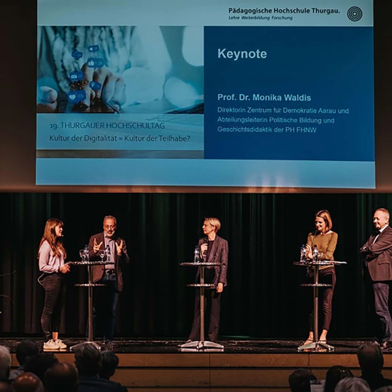 Einen Überblick über aktuelle Forschungen zum Thema, gerade auch im Hinblick auf die Digitalität an Schulen, gab Keynote-Sprecherin Prof. Dr. Monika Waldis, Direktorin des Zentrums für Demokratie Aarau und Abteilungsleiterin Politische Bildung und Geschichtsdidaktik der Pädagogischen Hochschule Fachhochschule Nordwestschweiz (PH FHNW). Sie zeigte zunächst die verschiedenen Dimensionen des digitalen bürgerlichen Engagements auf und spannte den Bogen zu Ungleichheiten im digitalen Raum. Ihre sechs Thesen für die Schule im digitalen Zeitalter beinhalteten zugleich die Forderung nach einer Anpassung der Schulen an die aktuellen und künftigen Entwicklungen und waren Basis der anschliessenden Podiumsdiskussion mit Prof. Dr. Monika Waldis, Prof. Dr. Daniel Süss, Hochschulratsmitglied und Professor für Medienpsychologie, PHTG-Prorektor und Medienpädagoge Prof. Dr. Thomas Merz, PHTG-Studentin Tamara Rohrer sowie Sabina Larcher als Moderatorin.