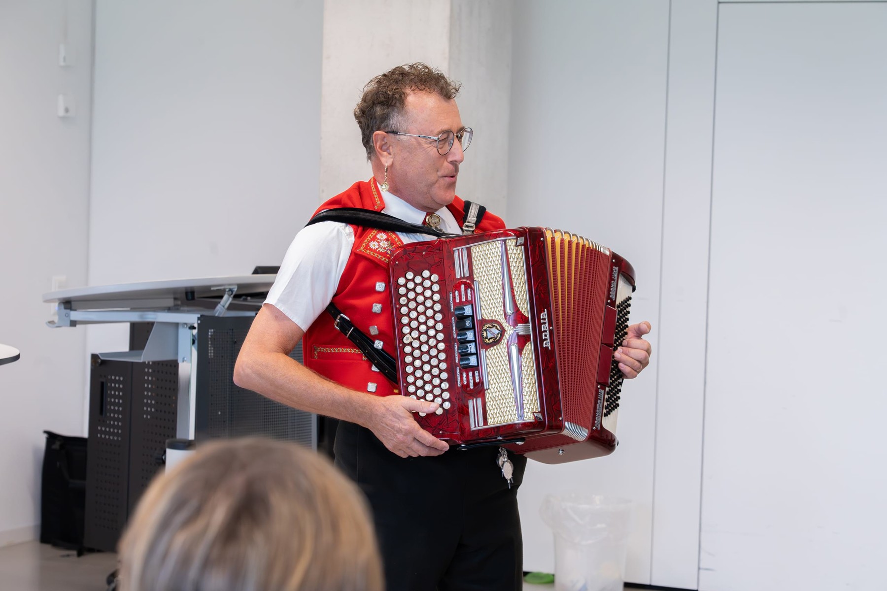 Ausserordentlich positiv war das Feedback zu den Führungen, bei denen die Teilnehmenden am Donnerstagabend «Architektonische Highlights der thurgauischen Lehrerinnen- und Lehrerbildung von 1833 bis heute», die Egelshofer Schulen oder die Landgrenze zu Deutschland erkunden konnten. Zum Tagungsabschluss gab es anstatt neudeutschem «Feedback» noch ein währschaftes «Echo» aus den Alpen»: Bruno Mock, Theaterpädagoge der PHTG, erschien in der Innerrhoder Tracht und brachte die rund 70 anwesenden Deutschdidaktiker:innen aus allen pädagogischen Hochschulen der Deutschschweiz zum Jodeln.