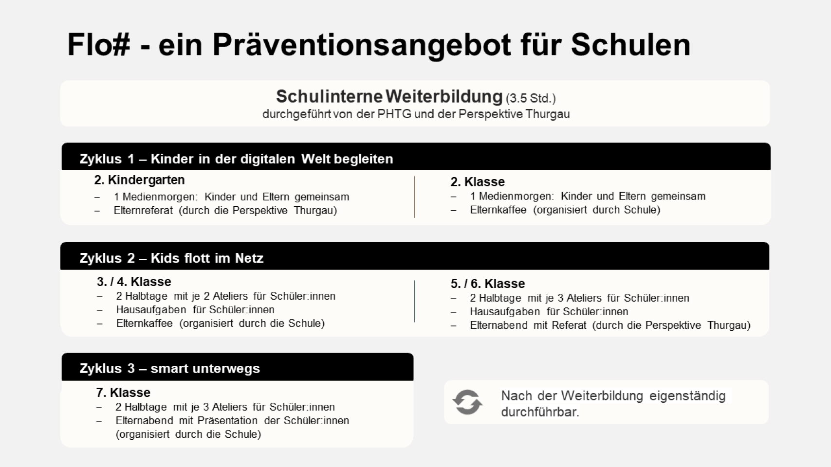 In der 3. und 4. Klasse besuchen die Schülerinnen und Schüler Ateliers zu Themen wie «Cybermobbing», «Games», «YouTube und Co.», «Meine Daten gehören mir» und «Bewegungspause». Ergänzend führt die Schule ein Elterncafé durch, bei dem Eltern mit Fachpersonen der Perspektive Thurgau oder der Jugendpolizei ins Gespräch kommen können.