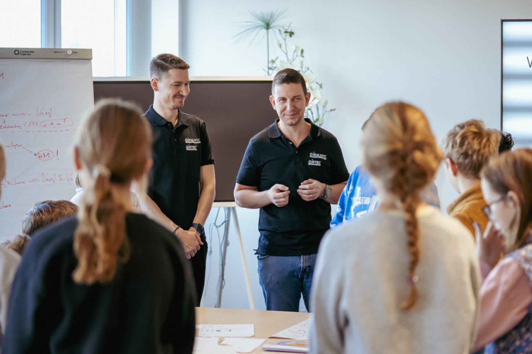 Am Workshoptag besprechen die Schüler:innen ihre Entwürfe mit Fachpersonen des Ingenieurwesens bei unserem Technologiepartner. Für die Weiterentwicklung und Überarbeitung der Prototypen nutzen wir agile Projektmethoden. Dieser Prozess wird von Matt Knaus, Design & Future Skills Coach, begleitet und moderiert.
